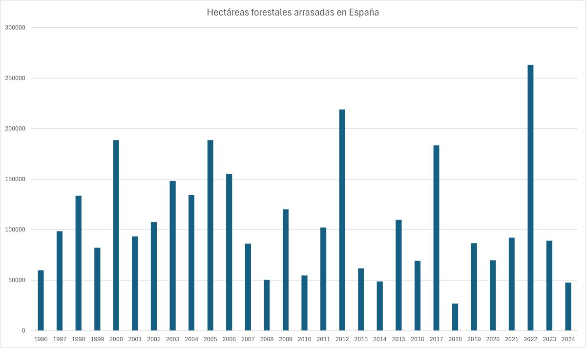 Hectáreas quemadas en España por año (datos MITECO).
